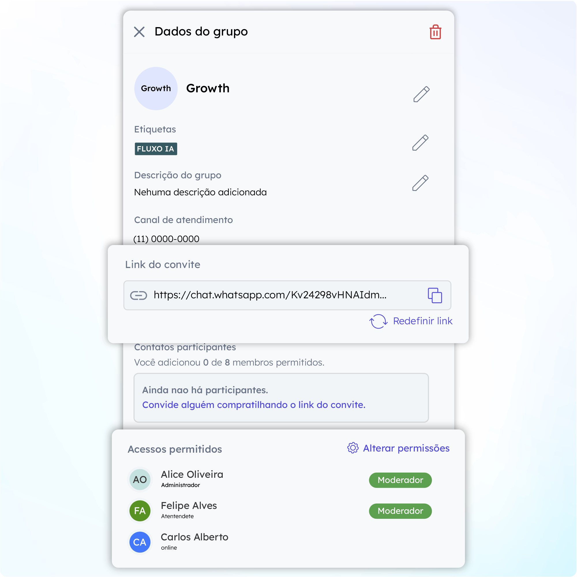 Os grupos não foram feitos para disparos ou promoções em massa. Eles foram criados para organizar conversas colaborativas, aproximando times e clientes de forma estruturada.