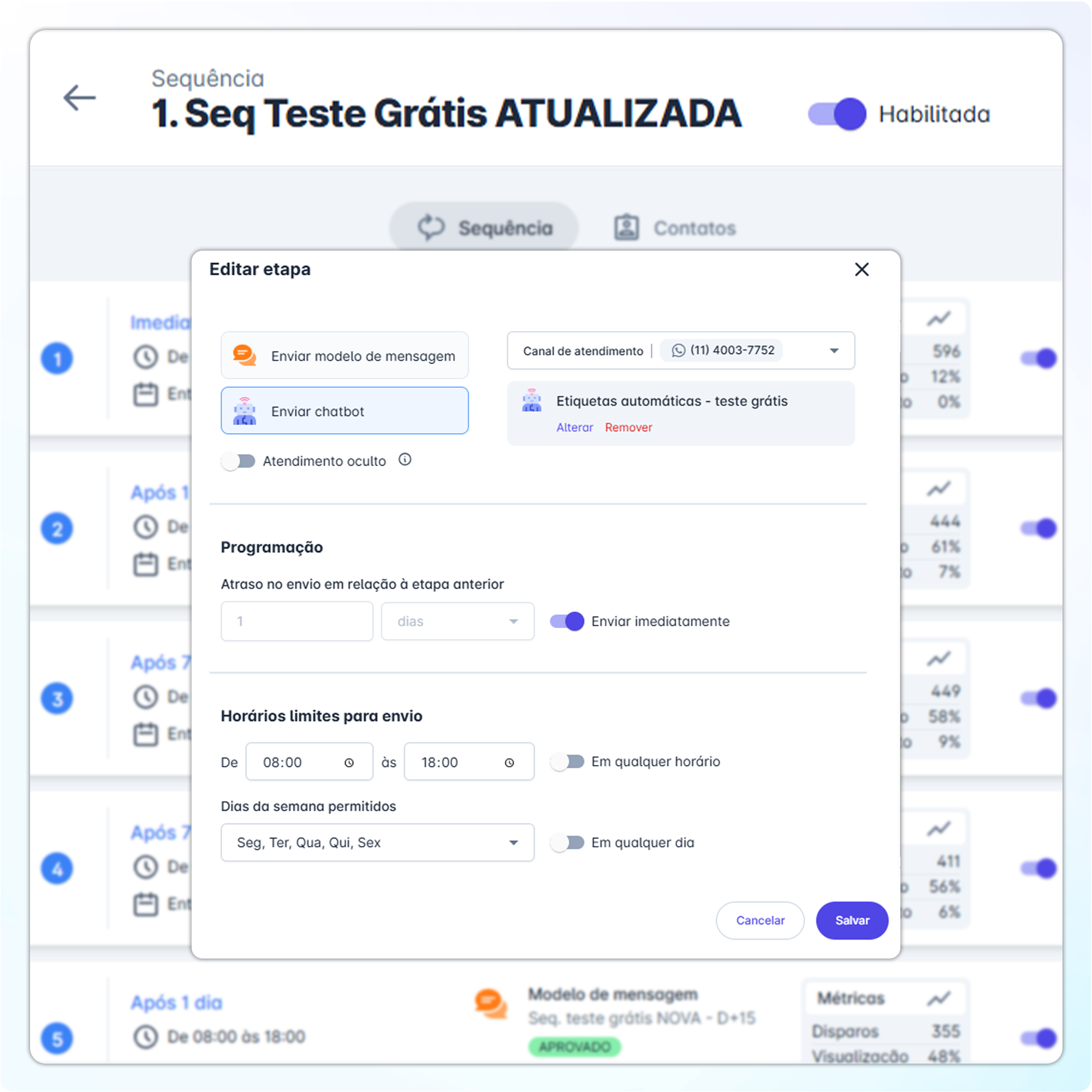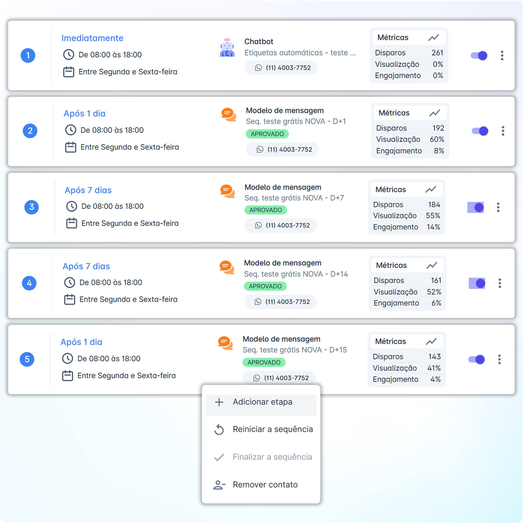 O fluxo de Sequência é configurado uma única vez. A partir daí, a plataforma dispara as mensagens automaticamente, respeitando os intervalos e as condições que você definiu.